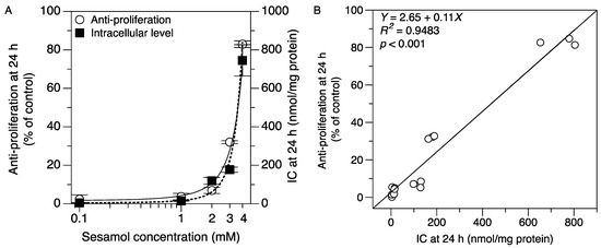 Correlation of intracellular concentration (IC) and antiproliferative effect of sesamol in SK-MEL-2 cells at 24 h. (A) The intracellular sesamol concentration (■) and antiproliferative effect (○) were fitted by an exponential model. (B) The linear regression analysis between intracellular concentration and the antiproliferation effect at 24 h (R2 = 0.9483, p < 0.001) using a Pearson correlation coefficient. The data were run in triplicate.