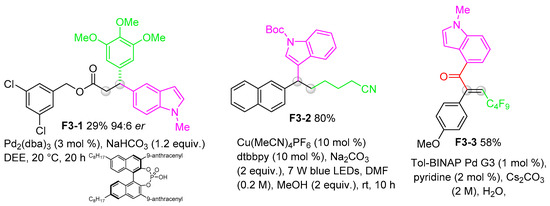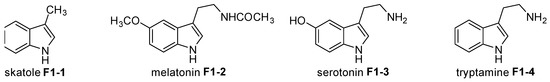 Indole is one of the simplest fused heterocyclic compounds known to act as a key scaffold of many naturally occurring molecules. For example, skatole (F1-1), melatonin (F1-2), serotonin (F1-3), and tryptamine (F1-4) are all well-known indole-based compounds (Figure 1). The functionalization of indoles, including the determination of their biological activities, has been the subject of considerable scientific research interest. Indeed, substituted indoles have been reported as affinity probes for the 5-hydroxytryptamine receptor [1], selective tumor-associated carbonic anhydrase inhibitors [2], carboxamide spleen tyrosine kinase inhibitors [3], selective inhibitors with broad hepatitis C virus genotype activity [4], Nav1.7 inhibitors [5], and TNFα inhibitors [6]. Further, the indole skeleton, as a constituent of naturally occurring substances, has been modified to furnish (−)-clavicipitic acid [7], breitfussin B [8], alstoscholarisines A and E [9], (+)-kopsihainanine A [10], and (−)-goniomitine [11].