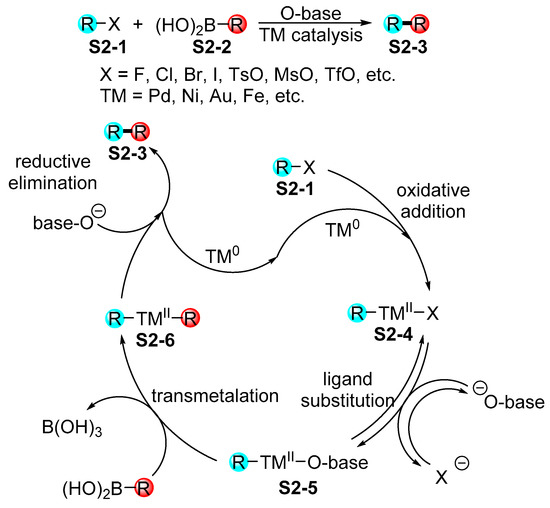 Transition metal-catalyzed cross-coupling reactions represent an indispensable tool for organic synthesis when considering the formation of C−C and C−heteroatom bonds. Among the available cross-coupling reactions, the Suzuki-Miyaura reaction [26,27] is the method of choice in terms of designing the construction of a C−C bond under mild reaction conditions. The Suzuki-Miyaura reaction involves a simple reaction between boronic acids S2-2 or boronates/trifluoroborates and electrophilic templates S2-1, as represented by halides, tosylates, triflates, or phosphates, in the presence of a base and transition metal catalyst. The good availability, low toxicity, and high stability of boronic acids all explain the widespread popularity of the Suzuki-Miyaura reaction. The reaction mechanism behind the Suzuki-Miyaura reaction involves a complex process [28] featuring oxidative addition, ligand substitution, transmetalation, and reductive elimination as the main reaction steps (Scheme 2).