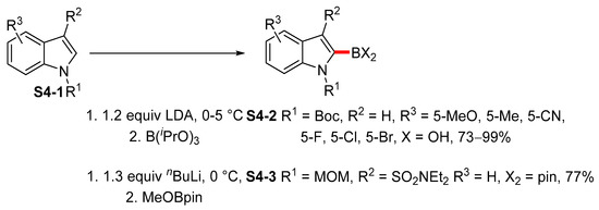 The alternative synthesis of indolylboronic acids by means of the reaction of lithiated indoles with borates takes advantage of ortho-metalation (Scheme 4). When compared to the bromine-lithium exchange reaction, ortho-lithiation reduces the number of steps required to synthesize indolylboronic acids; however, the presence of a directing group is required. Vazquez [45] and Snieckus [46] developed a protocol for indole lithiation by means of nBuLi or LDA. The isolated yields of indolylboronic acid S4-2 and boronate S4-3 were within the yield range of 77−99%. The regioselectivity of the published lithiation in these cases is driven by the presence of a directing group as well as by the highest pKa value of the H2 hydrogen [47].
