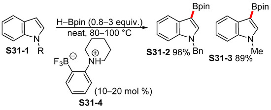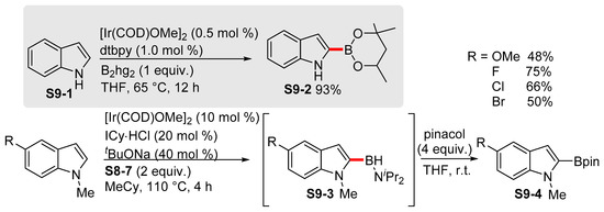 Since the discovery of the iridium-mediated C−H borylation reactions of aromatic substrates by Iverson and Smith [66], as well as the later improvement of the reaction conditions into iridium-catalyzed C−H borylation with B2pin2 or HBpin by Hartwig [67], the transition-metal-catalyzed borylation reactions have become one of the most versatile tools for the synthesis of borylated aromatic compounds. Heteroarenes, similar to indoles, can also undergo C−H borylation. The site selectivity of the reaction is an issue, as theoretically up to seven different sites can undergo C−H functionalization. Typically, in the case of unsubstituted indoles, the site selectivity is driven by electronic effects, as the reaction proceeds most readily at the C2 position where the C−H bond is the most acidic, and therefore, the most reactive. It is important to note, however, that selectivity can be overridden by steric factors. Several transition metals can be used for the borylation reactions of indoles, including iridium, platinum, nickel, and cobalt, although iridium-based catalytic systems with bipyridine ligands remain the most prevalent. In recent years, several site-selective and non-selective C−H borylation protocols of indoles have been developed, principally focusing on the recyclability of the expensive catalysts and site selectivity. Several boron sources can be used for the transition-metal-catalyzed C−H borylations of arenes (Scheme 8). The most common sources, namely HBpin (S8-1) and B2pin2 (S8-2), were established by Hartwig in relation to the transition-metal-catalyzed C2 borylation of indoles in the early 2000s [68].