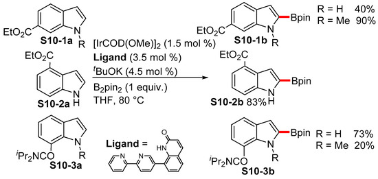 Chattopadhyay recently developed L-shaped ligands for the selective borylation of the remote sites (meta and para) of aromatic esters [71] and amides [72], and the protocol could also be applied to indoles. Indoles that lacked the ester- or amide-directing group did not undergo the borylation reaction, most likely due to the preferential complexation of the indole NH group to the catalyst, thus inhibiting the borylation. Interestingly, following the introduction of the directing group onto the indole scaffold, the borylation proceeded without meta- or para-selectivity, but always into the C2 position (S10-1b,2b,3b), which suggests that electronic effects in the case of indoles S10-1a,2a,3a played a crucial role in the site selectivity (Scheme 10). Exchanging the L-shaped ligands for simple tbdpy ligands under these reaction conditions resulted in the formation of complex mixtures of unselectively borylated indoles.