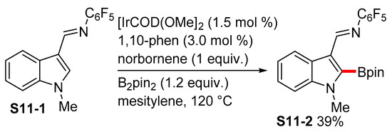 As shown above, the ester and amide functional groups remain stable during the iridium-catalyzed C−H borylation, although the aldehyde group is not stable. Therefore, Ito and Ishiyama developed a protocol whereby heteroaromatic pentafluorophenyl aldimines undergo iridium-catalyzed C−H borylation in moderate to high yields, with one example being the indole substrate S11-1 [73]. The aldimine functional group serves as both a directing group and a protection group, and it can be easily hydrolyzed so as to produce aldehydes (Scheme 11).