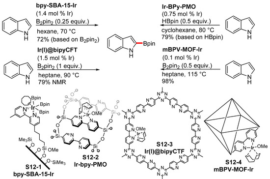 In an effort to enhance the prospects of catalyst recovery and recycling, several groups have developed iridium-based heterogeneous catalysts for the C−H borylation of aromatic and heteroaromatic compounds. For instance, Jones et al. prepared and applied the mesoporous silica-supported bipyridine-based iridium catalyst bpy-SBA-15-Ir (S12-1) for the borylation of indole (Scheme 12) [74]. The catalyst did not reach a turnover number (TON) higher than 136, although it could be repeatedly reused following simple filtration with only the gradual loss of activity with subsequent runs. Similarly, Inagaki developed the heterogeneous catalyst Ir-bpy-PMO (S12-2), which in combination with the inexpensive boron source HBpin facilitated the C−H borylation of aromatic and heteroaromatic compounds, while the catalytic activity of Ir-bpy-PMO was comparable to that of homogenous catalytic systems (Scheme 12) [75]. Another example of a heterogeneous catalyst for C−H borylation reactions is based on the covalent triazine framework (CTF) prepared by Van Der Voort et al. They developed a bipyridine-based CTF and then metalated it with the Ir(I) complex so as to prepare an air-stable catalyst (S12-3) for the C−H borylation of various aromatic compounds, including indole [76]. The borylation reactions proceeded in non-polar solvent under mild reaction conditions, and the catalyst could be recycled at least five times with only a small decrease in activity (Scheme 12). Excellent results have been achieved with heterogeneous catalysis when using the bipyridine-based metal-organic framework (mBPV-MOF-Ir) (S12-4) and the 1,10-phenanthroline-based metal-organic framework (mPT-MOF-Ir) catalysts developed by Lin et al. [77]. They used them for the C−H borylation of various aromatic and heteroaromatic substrates with very low catalyst loadings and excellent isolated yields of borylated products. Although prolonged reaction periods and high temperatures were required to achieve full conversion, the products were obtained by removing the catalyst via simple centrifugation and the catalysts could be recycled at least 15 times with no apparent loss of activity (Scheme 12). When using the mBPV-MOF-Ir catalyst, a TON of 9000 was achieved for the borylation of indole and the leached iridium content was found to be 0.3 ppm.