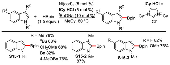 Nickel-catalyzed C2 borylations of various arenes and heteroarenes have been developed by the Chatani group [82]. In this instance, the catalytic system consisted of the transition metal and an NHC ligand. The reaction proceeded selectively into the C2 position in the case of indoles with nitrogen atoms variously substituted by the alkyl or benzyl groups (S15-1). Similar selectivity was achieved when positions 3 and 5 were substituted by the methyl (S15-2) or halogen and methoxy groups (S15-3), respectively (Scheme 15). The authors managed to employ cheap and air-stable Ni(OAc)2 rather than Ni(cod)2 for the gram-scale preparations, and they achieved excellent results. Similar conditions were used for the borylation of indoles under platinum catalysis conditions, although HBpin proved to be unreactive; therefore, B2pin2 was used as the boron source [83]. The reaction with B2pin2 proceeded selectively at the 2 position, and it offered the indoles S16-2 in moderate to very good yields (Scheme 16). Iwasawa also applied platinum catalysis for the borylation of indoles using the PSiN-pincer platinum complex, albeit with diminished selectivity [84].