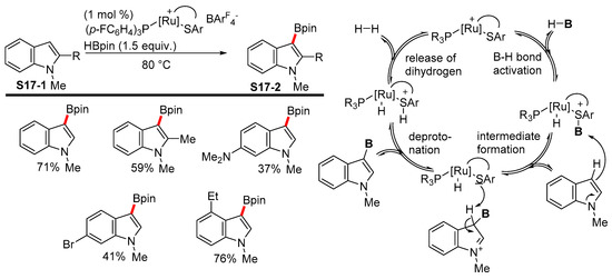 In 2013, Oestreich reported the new and synthetically useful C3-selective borylation of indoles S17-1 by means of the catalytic generation of borenium ions from HBpin [85]. The protocol required no added base, as H2 was released as the sole by-product and allowed to install the Bpin group onto the indole substrate via a SEAr reaction mechanism. Over the course of the reaction, the B−H bond is split by the ruthenium(II) thiolate complex, thereby affording ruthenium(II) hydride and borenium ions, which undergo an attack by the most nucleophilic site of the indole substrate. The subsequent deprotonation offers C3-borylated indoles in moderate to high yields (Scheme 17).