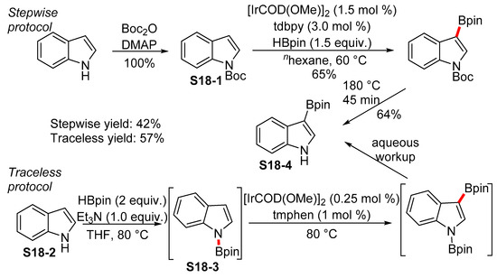 The regioselectivity of the iridium-catalyzed C−H borylation of indoles can be altered by installing a bulky group onto the indole substrate. The tert-butoxycarbonyl (Boc) group can be used in this way for nitrogen-containing heterocycles such as pyrroles, indoles, azaindoles, and pyrazoles where the N-Boc-protected pyrroles and indole S18-1 are selectively borylated into the 3 position [86]. However, the installation and removal of the directing group extend the time required for the overall procedure. Therefore, it is desirable to use a directing group that can be installed and removed without requiring the isolation of the intermediates. The protocol developed by Smith and Maleczka can be used as an example here, with the Bpin group serving as a traceless directing group for the selective C−H borylation of indoles into the 3 position (Scheme 18) [87]. The indole S18-2 is smoothly converted into the N-borylated indole S18-3 by means of the reaction with HBpin. The addition of Et3N is essential if the reaction is to proceed, as the coordination of the lone nitrogen pair with the boron center in the HBpin renders the B−H bond hydridic enough to react with as weak an acid as S18-2. The addition of the iridium catalyst into the reaction mixture causes the C−H borylation to proceed in the C3 position, while the aqueous workup gives 3-borylated indole S18-4 in a 57% yield (Scheme 18).