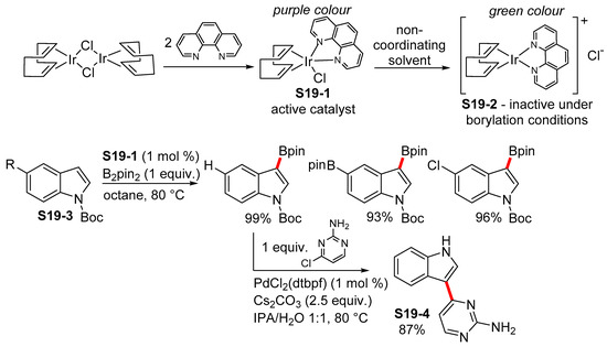 Colacot et al. studied the causes of prior inconsistent results and diminished the catalytic activity of the Ir complexes formed in situ using the simple and cheap ligand 1,10-phenanthroline. They determined that catalytically inactive cationic [Ir(COD)(phen)]+Cl- (S19-2) is rapidly formed in non-coordinating solvents, thereby diminishing the reactivity (Scheme 19). The authors managed to isolate the active complex [Ir(Cl)(COD)(phen)] (S19-1) and to utilize it for the selective borylation of the Boc-protected indoles S19-3. They achieved excellent results and then applied the catalyst based on the cheap ligand for the one-pot total synthesis of meridianin G (S19-4), thereby achieving an excellent overall yield [88].