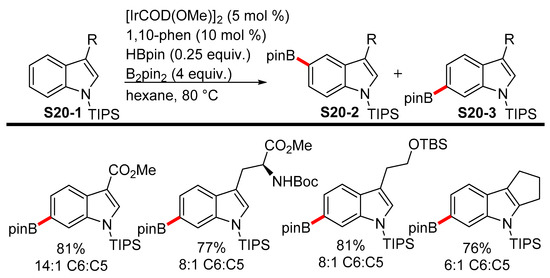Only one example of the selective C6-borylation of indoles can be found in the literature, and even it is not strictly C6-selective but rather C6-preferential. It was developed by Baran et al. in an attempt to achieve the first total syntheses of verruculogen and fumitremorgin A. The C6 selectivity is achieved by means of the careful substrate selection of only 3-substituted indoles S20-1 and the protection of the indole nitrogen by the robust TIPS group, thereby disabling the C−H activation reaction in the otherwise more reactive positions C2, C3, or C7 [89]. By optimizing the reaction conditions, the authors achieved good isolated yields of S20-3 as well as up to 14:1 C6:C5 selectivity on a limited substrate scope (Scheme 20).
