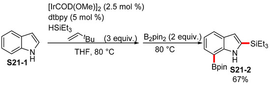Selective transition-metal-catalyzed C−H functionalization at the 7-position typically requires a substituent to be present at the 2-position so as to block reactivity at that site [90,91,92]. An example from the recent literature was developed by Takai, who exploited the iridium-catalyzed silylation of indole (S21-1) to functionalize the 2-position, followed by iridium-catalyzed borylation in the 7-position in a one-pot manner so as to prepare S21-2 (Scheme 21).