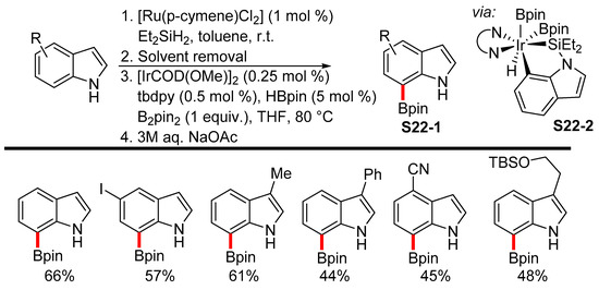 The requirement for an occupied 2-position can be avoided by means of the introduction of a silyl-directing group onto the nitrogen atom, as demonstrated by Hartwig in his one-pot protocol consisting of the Ru-catalyzed silylation of indoles, followed by the Ir-catalyzed borylation of the formed silylindole. The mild hydrolysis of the silyl group then selectively afforded the C7-borylated indoles S22-1 (Scheme 22) [93]. The borylation selectivity most likely arises from the formation of the five-membered metallacycle S22-2 through the C−H bond cleavage at the 7-position rather than of the four-membered metallacycle at the 2-position. Sperry applied an analogous approach for the synthesis of indolequinone natural products where even 5- and 6-methoxy-substituted indoles reacted selectively at the 7-position, thereby broadening the applicability of the developed protocol [94].