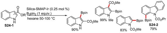 Several non-selective methods for the borylation of indoles have emerged over the last decade, which either produce multi-borylated indoles or else are highly substrate-specific and differently substituted indoles undergo borylation at different sites [99]. One such method concerns the ester-directed borylation of sulfur-, oxygen-, or nitrogen-containing five-membered heterocycles developed by Sawamura, whereby indoles S24-1 bear the ester functional group borylate at either the 2- or the 3-position depending on where the ester group resides. If the ester group is present at the nitrogen atom, then the borylation occurs at the 2-position, and it only occurs at the 7-position (S24-2) when the 2- and 3-positions are occupied (Scheme 24) [100].