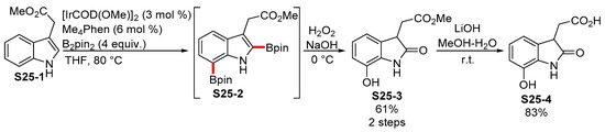 As mentioned above, the borylations of indoles often proceed at multiple sites, most frequently at the C2 and C7 positions [101]. Protodeboronation at C2 can lead to selective C7 borylation, although that is not the only application of the inherent reactivity regarding indole borylations. Sperry applied a diborylation/oxidation protocol for the short total synthesis of an endogenous plant metabolite 7-hydroxyoxindole-3-acetic acid S25-4, which required only one chromatography separation (Scheme 25) [102]. Utilizing the Me4Phen ligand and an excess of B2pin2 was crucial for achieving the full conversion of the S25-1 into S25-2.