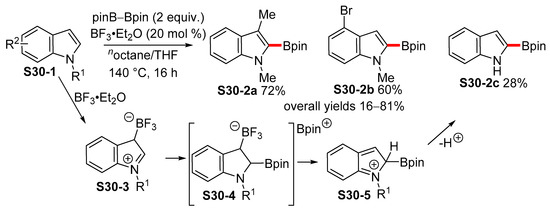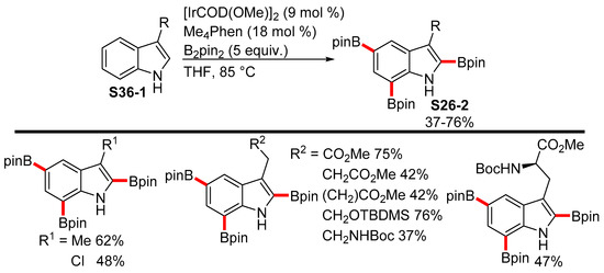 Sperry also developed a reaction condition for the threefold borylation of 3-substituted indoles S26-1 by employing iridium catalysis with the Me4Phen ligand. During the course of the reaction, the C−H borylation first proceeded quickly at the C2 and C7 positions, and then further, at the C5 position due to steric effects [103]. Several triborylated 3-substituted indoles S26-2 were prepared by following the described protocol (Scheme 26).