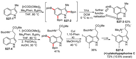 Sperry then expanded the protocol to achieve the synthesis of 5,7-diborylated-3-methylindole S27-3 from 3-methylindole S27-1 utilizing the triborylation/C2-protodeboronation sequence in a one-pot manner (Scheme 27) [104]. The author showed that the two boryl groups in positions 5 and 7 of the S27-3 can be further functionalized in a selective or non-selective way so as to prepare valuable indoles bearing the aryl group, methoxy group, or halogen atoms in the aforementioned positions. Additionally, this method was applied to achieve the total synthesis of (+)-plakohypaphorine C (S27-5) from Boc-protected L-tryptophan methyl ester (S27-4) (Scheme 27).