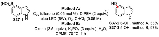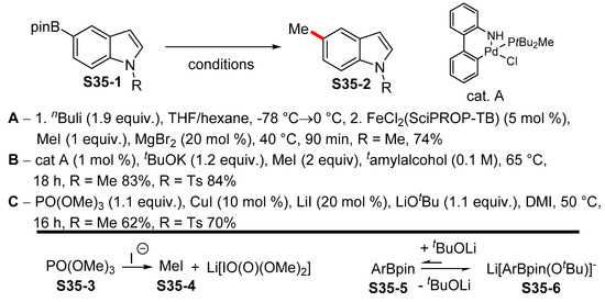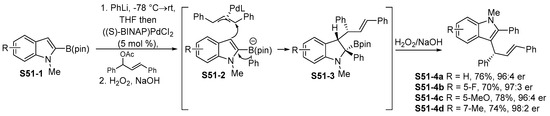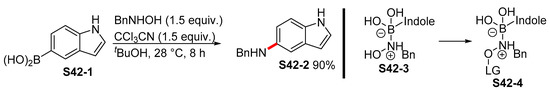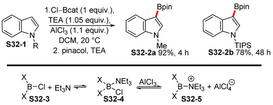 A similar approach was reported by Garg in relation to the 4-indolylboronic acid pinacol ester S5-2 (Scheme 5) [48]. The carbamate group was used as a traceless directing group, which allows for regioselective lithiation in position 4 of the indole scaffold. Once the Bpin fragment was introduced, the carbamate moiety was removed by means of a Ni-catalyzed reduction by 1,1,3,3-tetramethyl-disiloxane (TMDSO).