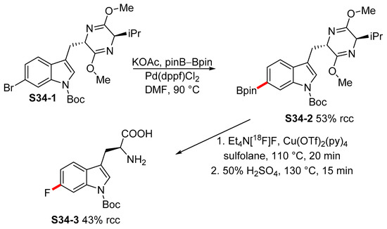 - Schäfer, D.; Weiß, P.; Ermert, J.; Castillo Meleán, J.; Zarrad, F.; Neumaier, B. Preparation of No-Carrier-Added 6-[18F]Fluoro-l-tryptophan via Cu-Mediated Radiofluorination. Eur. J. Org. Chem. 2016, 4621–4628. [Google Scholar]