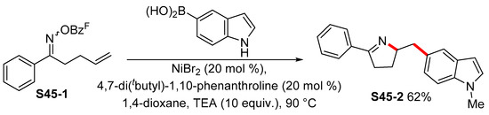 - Yang, H.-B.; Pathipati, S.R.; Selander, N. Nickel-Catalyzed 1,2-Aminoarylation of Oxime Ester-Tethered Alkenes with Boronic Acids. ACS Catal. 2017, 7, 8441–8445. [Google Scholar] [CrossRef]