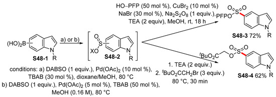 - Vedovato, V.; Talbot, E.P.A.; Willis, M.C. Copper-Catalyzed Synthesis of Activated Sulfonate Esters from Boronic Acids, DABSO, and Pentafluorophenol. Org. Lett. 2018, 20, 5493–5496. [Google Scholar] [CrossRef]