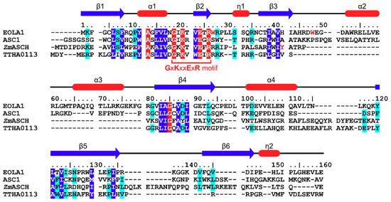 Sequence alignment of EOLA1 with structurally similar proteins. Sequences alignment of EOLA1, ASC-1, ZmASCH, and TTHA0113 based on Dali analyses [19]. The secondary structure of EOLA1 is shown above its sequence; helices and β-strand are represented as red tubes and blue arrows, respectively. Identical and conserved residues among four proteins are marked with red and blue boxes, respectively. Conserved residues among three of four proteins are marked with cyan boxes.