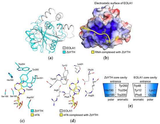 Interestingly, we could observe that the RNA molecule bound to ZsYTH is well accommodated when superimposed onto the EOLA1 structure (Figure 4a,b). The methylated adenine, the target nucleotide of ZsYTH, extends into the core cavity of EOLA1 while the phosphodiester backbone is located within the basic cleft of EOLA1.