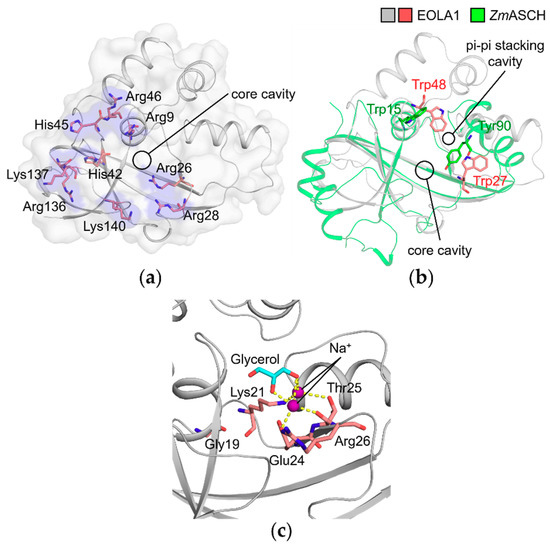 The possibility of nucleic acid binding to EOLA1 can be supported by the basic cleft and patch that could provide an electrostatic interacting surface for phosphodiester backbones of nucleic acid as observed in ZsYTH [15] (Figure 4b). A similar basic patch is observable in ZmASCH, which exhibits nuclease activities on single-stranded RNA. [14]. Arg9, Arg26, Arg28, His42, His45, Arg46, Arg136, Lys137, and Lys140 of EOLA1 protrude out towards the protein surface and form a basic patch that surrounds the core cavity (Figure 5a).