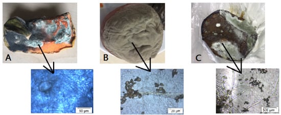 Spoilage fungi: (A) R. oryzae from pumpkins, (B) R. stolonifier from peaches, and (C) A. penicillioides form prunes.