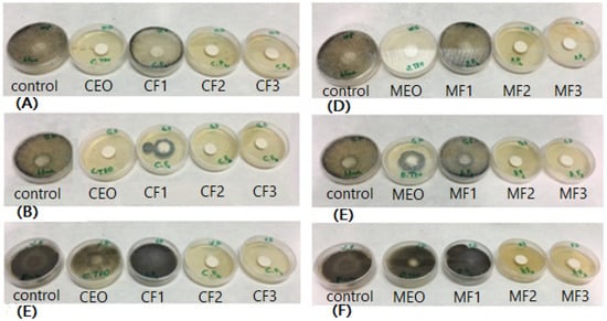 Visual observation of fungal growth inhibition (FGI) of Carum carvi L. essential oil (CEO) and its fractions against (A) R. oryzae, (B) R. stolonifier, and (C) A. penicillioides. FGI of Origanum majorana L. essential oil (MEO) and its fractions against (D) R. oryzae, (E) R. stolonifier, and (F) A. penicillioides. Media after seven days at 27 ± 1.5 °C.