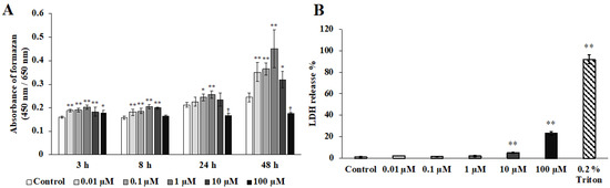 Human gingival fibroblasts were seeded in 96-well microplates at 2 × 104 cells/mL in 100 μL normal culture medium. The cells were allowed to adhere for 24 h, the medium was exchanged for medium containing shikonin (0.01, 0.1, 1, 10, or 100 μM) or without shikonin (control), and the cells were incubated for 48 h. Triton (0.2%, Sigma-Aldrich, St. Louis, MO, USA) was used as a positive control. Lactate dehydrogenase (LDH) activity was measured using the Cytotoxicity LDH Assay Kit-WST (Dojindo Laboratory, Kumamoto, Japan), as described in the instruction manual. The absorbance of each well was measured at 490 nm, and the data were analyzed by using the SoftMax® Pro Microplate Data Acquisition and Analysis software to determine the formazan content.