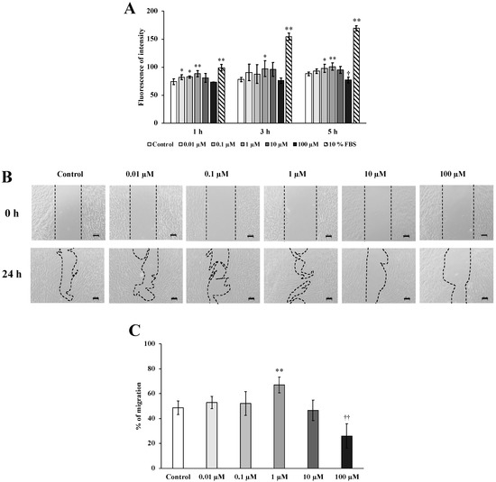 Effect of shikonin on human gingival fibroblast (hGF) migration and wound repair. (A) hGF migration in response to control or shikonin treatment (0.01, 0.1, 1, 10, or 100 µM) (* p < 0.05 at 1, 3, and 5 h vs. control; ** p < 0.01 at 1, 3, and 5 h vs. control; † p < 0.05 at 1, 3, and 5 h vs. control). Fetal bovine serum (10%) was used as the positive control. (B) Wound healing was measured after 0 and 24 h (Scale bar = 100 µm). (C) The change in the wound area is presented as the ratio of the final to the initial wound size (** p < 0.01 vs. control; †† p < 0.01 vs. control).