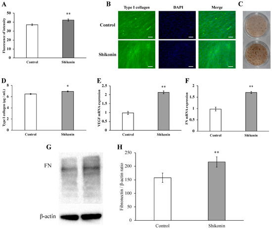 Type I collagen synthesis by human gingival fibroblasts (hGF) treated with or without 1 µM shikonin. Immunostaining for type I collagen using an anti-type I collagen monoclonal antibody. (A) Intensity of fluorescence immunostaining without (control) or with shikonin (** p < 0.01 vs. control). (B) Cells were incubated with fluorescently labeled secondary antibody and stained with DAPI (scale bar= 500 μm). (C) After incubation of the cells with the secondary antibody, chromogenic immunostaining was performed, and images were obtained by using a single-lens reflex camera. (D) Type I collagen in the cell culture supernatant after treatment for 1 week was measured by using ELISA. (* p < 0.05, control vs. 1 µM shikonin). (E,F) Effects of shikonin on the gene expression of VEGF and FN in stimulated hGFs incubated with 1 µM shikonin for 24 h prior to cell harvest. The gene expression of VEGF and FN was determined by using PCR. (** p < 0.01, control vs. 1 µM shikonin). (G) Protein expression of FN was evaluated by immunoblotting analysis. (H) The quantification was performed using image analysis software. (** p < 0.01 vs. control).