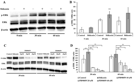 Effect of shikonin on the activation of the MAPK signaling pathway component ERK 1/2. Human gingival fibroblasts were cultured in medium without (control) or with 1 µM shikonin for 0, 30, or 60 min. (A) Protein expression was evaluated by immunoblotting analysis. (B,D) The quantification was performed using image analysis software (** p < 0.01, control vs. 1 µM shikonin; †† p < 0.01, 1 µM shikonin vs. 1 µM shikonin + PD98059 (10 µM, 20 µM and 40 µM). (C) Effect of PD98059 (ERK 1/2 inhibitor) on shikonin-stimulated activation of the MAPK signaling pathway.
