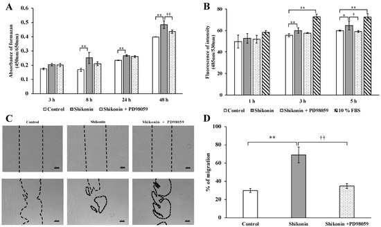 Effects of PD98059 on shikonin-stimulated human gingival fibroblast (hGF) cell proliferation and migration and wound repair. Treatment with 20 µM PD98059 reduced 1 µM shikonin-stimulated hGF (A) proliferation and (B) migration. (C) Images of wound repair and (D) quantitative data for wound repair. (* p < 0.05, control vs. 1 µM shikonin; ** p < 0.01, control vs. 1 µM shikonin; † p < 0.05, 1 µM shikonin vs. 1 µM shikonin + 20 µM PD98059; †† p < 0.01, 1 µM shikonin vs. 1 µM shikonin + 20 µM PD98059). In the cell-migration assay, 10% fetal bovine serum was used as a positive control.