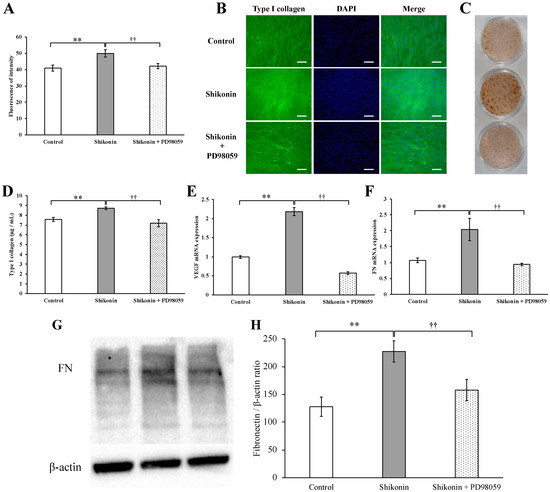 Effect of PD98059 on type I collagen synthesis stimulated by shikonin in human gingival fibroblasts. Type I collagen synthesis was determined by (A) fluorescence immunostaining and (B) fluorescence microscopy. (scale bar = 500 μm). (C) The effect of PD98059 on type I collagen synthesis was also analyzed by chromogenic immunostaining and photographed using a single-lens reflex camera. (D) Type I collagen in the cell culture supernatant after treatment for 1 week was measured by using ELISA. (E,F) Effect of PD98059 on the expression of VEGF and FN stimulated by shikonin in hGFs. Gene expression was determined by PCR. (G) Protein expression of FN was evaluated by immunoblotting analysis. (H) The quantification was performed using image analysis software. (** p < 0.01, control vs. 1 µM shikonin; †† p < 0.01, 1 µM shikonin vs. 1 µM shikonin + 20 µM PD98059).