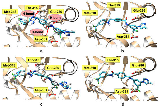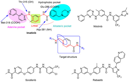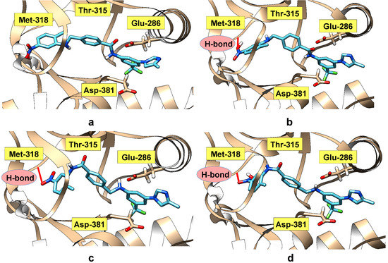 Compounds shown in Figure 1 are ATP-competitive inhibitors, classified as type II inhibitors, by reference to the conformation of the highly conserved aspartate–phenylalanine–glycine (DFG) motif in the beginning of the activation loop in the C-lobe of the kinase domain [19].