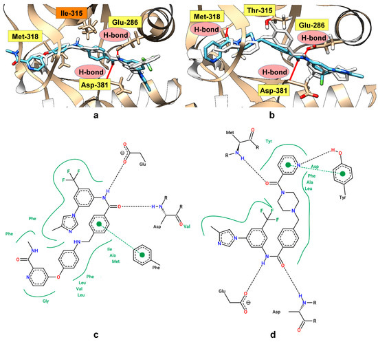 Binding models of inhibitor 10 and 28l to Abl kinase. Hydrogen bonds are indicated by red lines to key amino acids. (a) Binding model of 10 with T315I-mutant Abl (PDB: 3QRJ; H-bond—Asp-381, Glu-286). Experimental binding model of rebastinib is shown in white. (b) Binding model of 28l with Abl-wt (PDB: 3CS9; H-bond—Met-318, Asp-381, Glu-286). Experimental binding model of nilotinib is shown in white. (c) Two-dimensional interactions map of 10 with T315L-mutant Abl (PDB: 3QRJ; H-bond—Asp-381, Glu-286). (d) Two-dimensional interactions map of 28l with Abl-wt (PDB: 3CS9; H-bond—Met-318, Asp-381, Glu-286, Tyr-253).