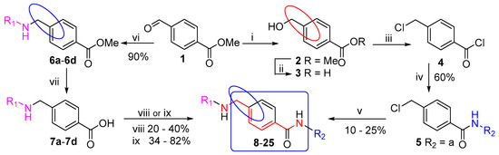 In the first approach, the initial methyl 4-formylbenzoate (1) was converted to benzoyl chloride 4 with a quantitative yield by known methods [20,21]. A key intermediate product 5 was obtained by the interaction of 4 with amine a in chloroform with 60% yield. Compounds 8–12 were synthesized by the reaction of primary amines a/b/c/e/g with the 4-(chloromethyl)benzamide (5) with moderate yields (10–25%).