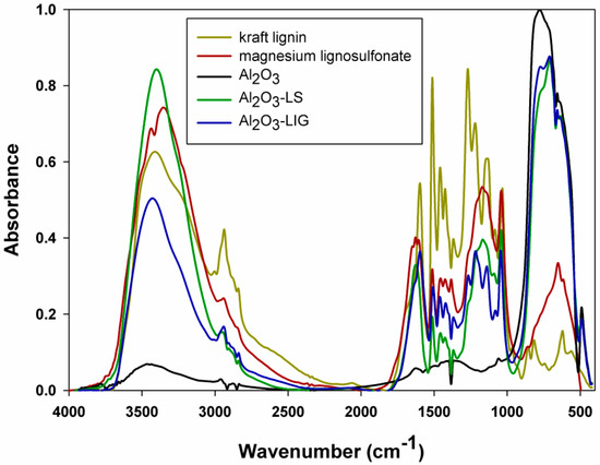 The effectiveness of the preparation of Al2O3-lignin and Al2O3-lignosulfonate hybrid materials using the mechanical method was confirmed by FTIR spectroscopy (see Figure 1). As can be observed, individual bands originating from the unmodified components are visible on the spectra of the final hybrid systems. In fact, the applied method of preparation enabled the effective combination of individual components by means of weak hydrogen bonding interactions, which is evidenced primarily by small shifts in the absorption maxima of the bands, especially for hydroxyl groups. This clearly confirms the successful preparation of inorganic-organic hybrid systems classified as class I. A mechanism for the linking of the inorganic part (alumina) and lignin was proposed in our previous publication [7].