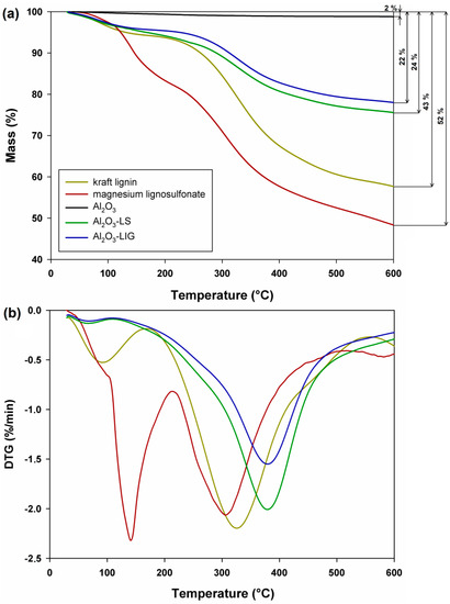 The TGA curve for alumina indicates a low 2% loss of sample mass, which is caused by the loss of water physically bound to the surface of the material. This result confirms one of the many advantages of the inorganic precursor used, and confirms its high thermal stability over a wide temperature range [7]. The TGA curves for the biopolymers used (kraft lignin and magnesium lignosulfonate) show sample mass losses of 43% and 52% respectively, which indicates the limited thermal stability of the tested products. For both biopolymers, the first stage of mass loss (in a temperature range of ~25–220 °C) is mainly associated with the local elimination of water bound on the surface of the materials. The second stage, which entailed a much higher mass loss in a temperature range of 220–600 °C, is associated with the complex thermal decomposition of the compound, resulting in partial elimination of lignin fragments, which is related to fragmentation of the molecule due to unclear and uncontrolled reactions. These observations are confirmed by previously published papers [5,7,8,11].