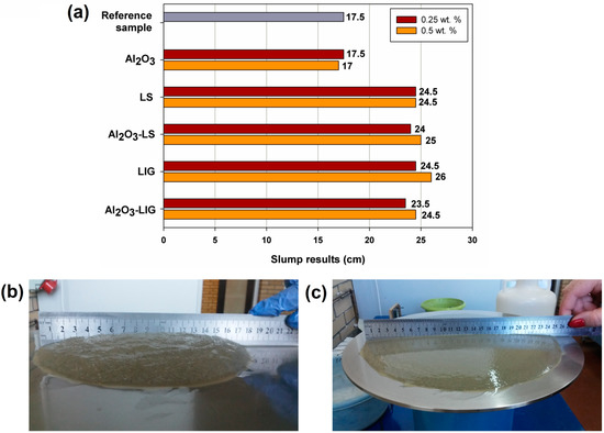 Slump test results for the analyzed samples (a) and digital photos of the slump for the reference sample (b) and the mixture containing 0.5 wt.% admixture of alumina-lignin hybrid material (c).