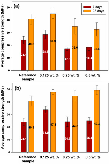 Tests were conducted to determine the compressive strength of the obtained cement mortars. The results of the tests after 7 and 28 days of curing are presented in Figure 5a for samples with lignosulfonate admixture, and in Figure 5b for samples with lignin.