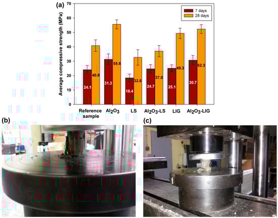 Compressive strength test results for samples containing 0.5 wt.% admixture after 7 and 28 days (a) and photos obtained during compressive strength tests for alumina-lignosulfonate (b) and alumina-lignin (c) hybrid materials.