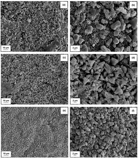 SEM images were prepared to evaluate the microstructural nature of unmodified cement mortar and mixtures with admixtures of hybrid materials containing alumina and lignin or lignosulfonate. The images are presented in Figure 7. In the SEM image for cement composite without any admixture (see Figure 7a,b) the grains of cement and the way in which they are cross-linked with the aggregate are clearly visible. In the subsequent SEM images of mixtures containing admixtures of the Al2O3-lignosulfonate (Figure 7c,d) or Al2O3-lignin (Figure 7e,f) hybrid system, macromolecular biofilms are clearly visible, with a multi-layered agglomerate with smaller alumina particles evenly embedded on the surface. In case of both hybrid admixtures, the analyzed products have a relatively homogeneous microstructure. A slight deformation of air bubbles is observed only in the case of the admixture of alumina-lignosulfonate hybrid material, which results from aeration of the cement mixture and negatively influences its strength properties, as demonstrated in Section 3.2.