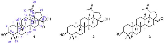 The structures of betulinic acid (1) with carbon atom numbering), betulin (2), and its aldehyde (3).