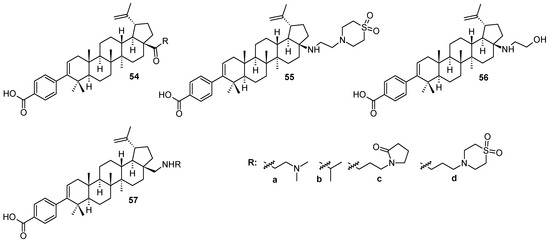 Amides of the general formulae 54−57 (Figure 2), incorporating a basic side chain, provided excellent potency against both wild type and V370A viruses while maintaining a low human serum shift [64,65]. In addition, 54a exhibited an EC50 = 31 nM against the ΔV370 Gag polymorphism. In turn, the structures 54 exhibited low oral exposure, attributed to a combination of poor solubility and low membrane permeability, precluding their further advancement [65]. To improve the disadvantages of the structure 54, the structures 55 and 56 were developed. However, their antiviral activity did not increase in comparison with those of 54. To proceed with improving the disadvantages of 54−56 again, the dibasic C-28 amine 57a and monobasic 57b were designed. Later on, an optimized structure 57c showed improved antiviral profile in screening tests against three viruses [65]. However, 57c became a subject of additional structural modification resulting finally in 57d, which demonstrated targeted antiviral activity and improved oral exposure in rats. Installing the more basic amine closer to the lipophilic core had the effect of shielding the NH and may have a positive impact on the permeability properties of the molecule and, ultimately, on oral exposure [64,65].
