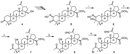 Thus, a synthesis of novel 2,3-seco-triterpenoids and triterpenoids bearing five-membered ring A, all displaying cytotoxicity, was published (Scheme 1) [42]. The compounds were prepared on the basis of betulone (4) that is modified to the 2-oxime derivative of betulonic acid (5) by a several steps procedure [42,43]. Further structural modification of 5 (Scheme 1) resulted in a subsequent synthesis of the compounds 6–9 [42], representing the most cytotoxic structures of this series of compounds [42]. Their antiproliferative activity was tested on various human cancer cell lines. The compound 9 of this series showed adequate selectivity and cytotoxicity towards several important cancer cell lines, and, therefore, it was selected as the most active compound (IC50 = 3.4–10.4 µM for HEp-2, HCT116, RD TE32, and MS cancer cells). It was capable of triggering caspase-8-mediated apoptosis in HCT116 cancer cells accompanied by typical apoptotic chromatin condensation with no loss of mitochondrial membrane permeability.