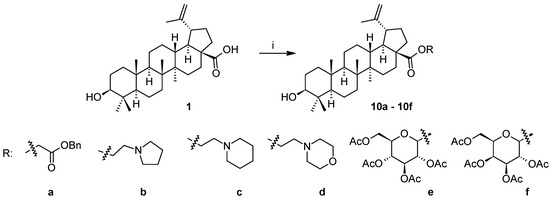 To proceed with this investigation, a synthesis of a large series of novel hydrophilic esters of triterpenoid acids with cytotoxic activity was presented, and 1 was one of the natural products selected for the derivation [44]. Complex alcoholic groups (aliphatic or containing heterocycles), glycolic unit and monosaccharide groups were used as structural modifiers (Scheme 2). An easy synthetic procedure was described, in which the introduction of the above-identified substituents resulted in the preparation of the compounds with high cytotoxicity (10a–10f) [44]. Compound 10f was the most selectively active compound of this series, effective against MCF7 (IC50 = 2.5 µM), HeLa (IC50 = 3.3 µM) and G-361 (IC50 = 3.4 µM) cancer cell lines.