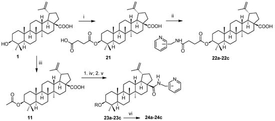 Picolyl amides of betulinic acid were investigated for their ability to cause tumor cell apoptosis (Scheme 4) [53]. The synthetic procedures described in the literature [53] in details, started at 1 and resulted in either of the target structures 22a–22c or 24a–24c (Scheme 4). While the picolyl amides of steryl hemiesters investigated in the past suffered from their low cytotoxicity [54], several of the picolyl amides of 1 showed high and even sub-micromolar effects [53]. The higher cytotoxicity was observed for the picolyl amine-based amides 22a–22c in comparison with that of 24a–24c. In the screening tests in G-361 human malignant melanoma cell line, 22b showed therapeutic index TI = 100 (Table 2), which makes this derivative bearing the piperazine motif in the molecule to become one of the most important and most perspective compounds of this series [53].