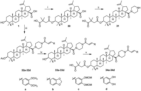 Modified bevirimat derivatives 31−34d (Scheme 6) showed improved anti-HIV activity in comparison with 30 [58]. The procedures to synthesize 31, 34a−34c, and, subsequently, 34d (Scheme 6) are described in the original literature [26]. The studied bevirimat analogs 31−34d bear piperazine moiety in the molecule, which is quite often structural modification in drugs in general [59]. The so far made studies have resulted in a finding that piperazine can contribute to improving drug-like properties of the target compounds, namely bioavailability and metabolism [60,61]. Two nitrogen atoms located at the opposite positions in the piperazine molecule determine this compound as a convenient linker for merging desired structural motifs. Having different pharmacophores with different mechanisms of action in a single molecule may result in designing new compounds with enhanced efficacy [26]. Compound 34c was found to be 3- to 50-times more potent than 30 against different types of the virus. A preliminary investigation of the mechanism of action indicated that 34c is a HIV maturation inhibitor with good metabolic stability [26].