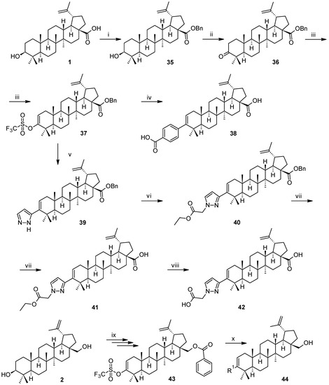 - Csuk, R.; Schmuck, K.; Schäfer, R. A practical synthesis of betulinic acid. Tetrahedron Lett. 2006, 47, 8769–8770. [Google Scholar] [CrossRef]
